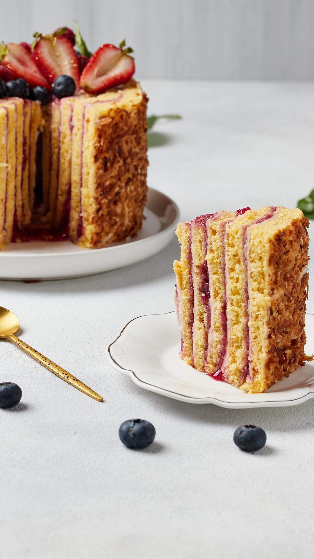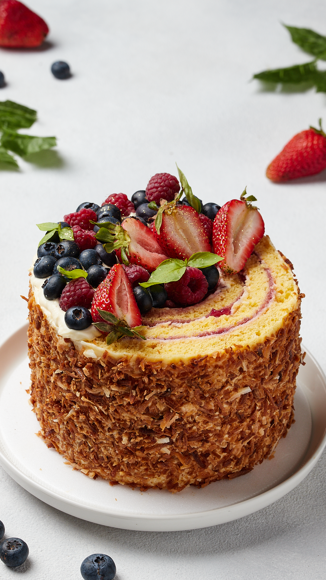 “Un bocado que conecta con lo natural. 💛 Un bizcocho de vainilla suave y esponjoso, acompañado de una delicada crema y mermelada de mora, cubierto con coco crocante y frutos rojos frescos. 🌸 Cada mordisco es un viaje al bosque, lleno de frescura y sabor auténtico, perfecto para compartir en esta temporada